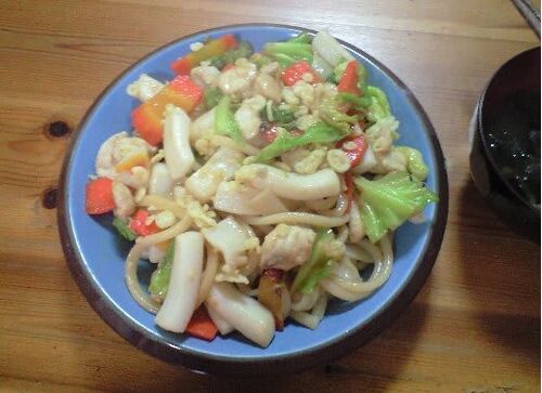 今日は大時化で釣りはお休み。 teruterubouzさまがなかなか起きてこないので、仕方なく冷蔵庫の残り物でブランチを。 冷凍庫にアオリイカとショウサイフグが残ってた。 野菜室にはキャベツとニンジン。 じゃあ、焼きうどんでも作ろうか。 アオリはキロ級サイ…