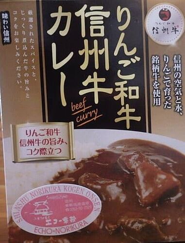 夏に乗鞍高原に行ったときに、自分で自分に買った^^;おみやげ。 リンゴで育てた信州牛のカレーですよ。 エコー乗鞍のシールも。また行きたいなぁ、乗鞍。 オーソドックスにカレーライスでいただきます。 小ぶりの牛肉ですが、柔かくていい味です。ルーはやや…